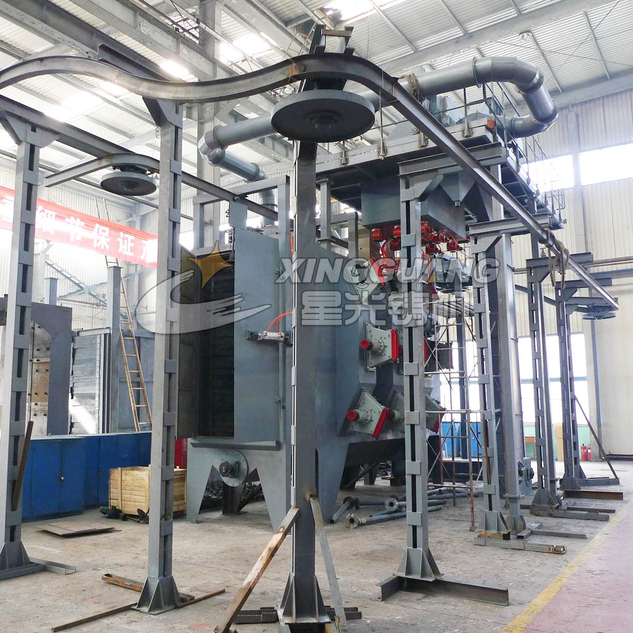 吊鉤式拋丸機分為單吊鉤和雙吊鉤,由吊鉤將工件送入清理室內,利用拋丸器將拋丸彈向工件,高速運轉之下,打磨掉工件所有部位的粗糙面,使得工件變得美觀,同時又增強工件的壓應力?!?/p>